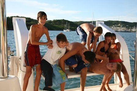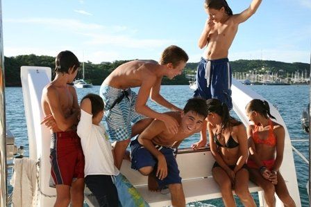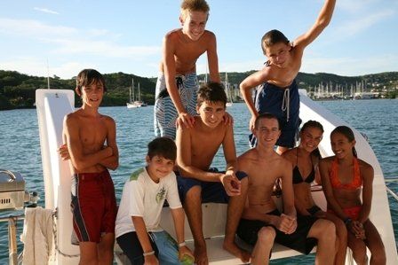For the first time, we sailed into a harbor that is PACKED with cruising boats. A few of them are friends of ours and from the photo (and more in the photo gallery) you'll know exactly what our kids have been doing for the past 48 hours. It's been non-stop, flips, wakeboarding, swimming and tubing with 6 other kids in the anchorage. They range in age from 9 to 16 and Tom calls them the "armada". There's a couple of German kids, 2 French Canadians, 2 southern US boys and then our 2 New Englanders. It's nice to see them all having a great time. More in future postings. :-)